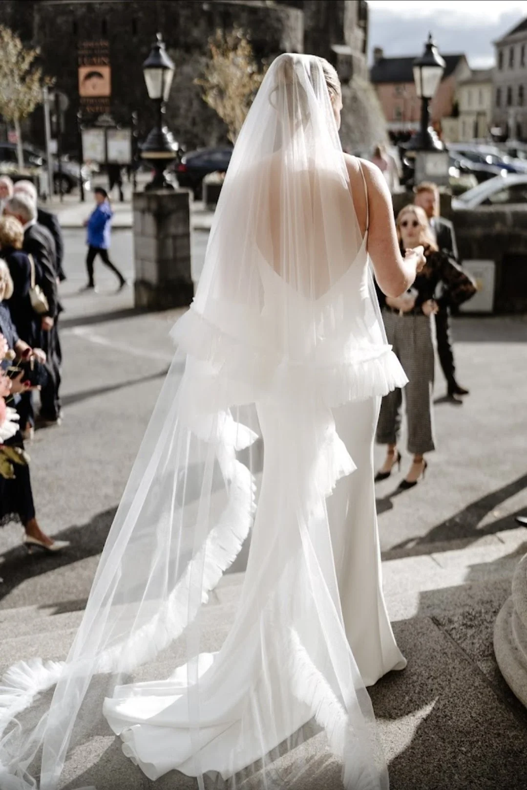 Bridal veil with ruffle edge. Cathedral length, with blusher. Customisable for bespoke veil lengths.